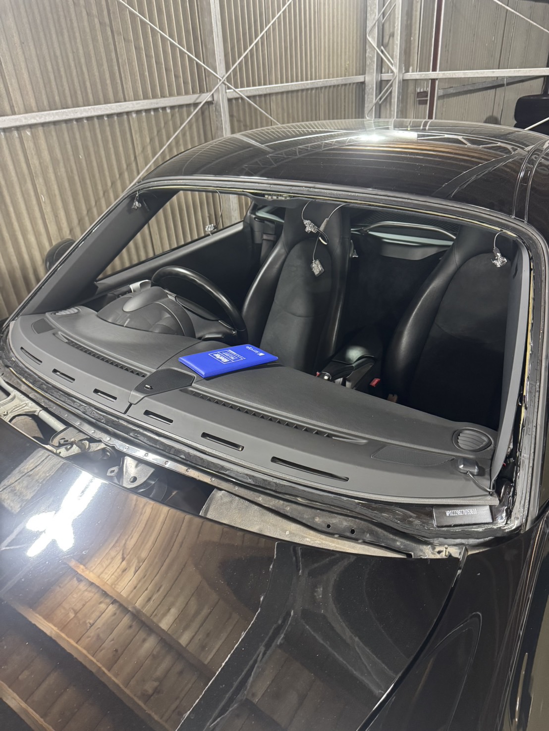 ポルシェ専用設計のガラスを手配し、車体フレームに傷をつけないように細心の注意を払いながら既存ガラスを取り外しました。接着面の古いシーリングを完全に除去し、下処理を丁寧に行うことで、新しいガラスの密着性と耐久性を高めました。