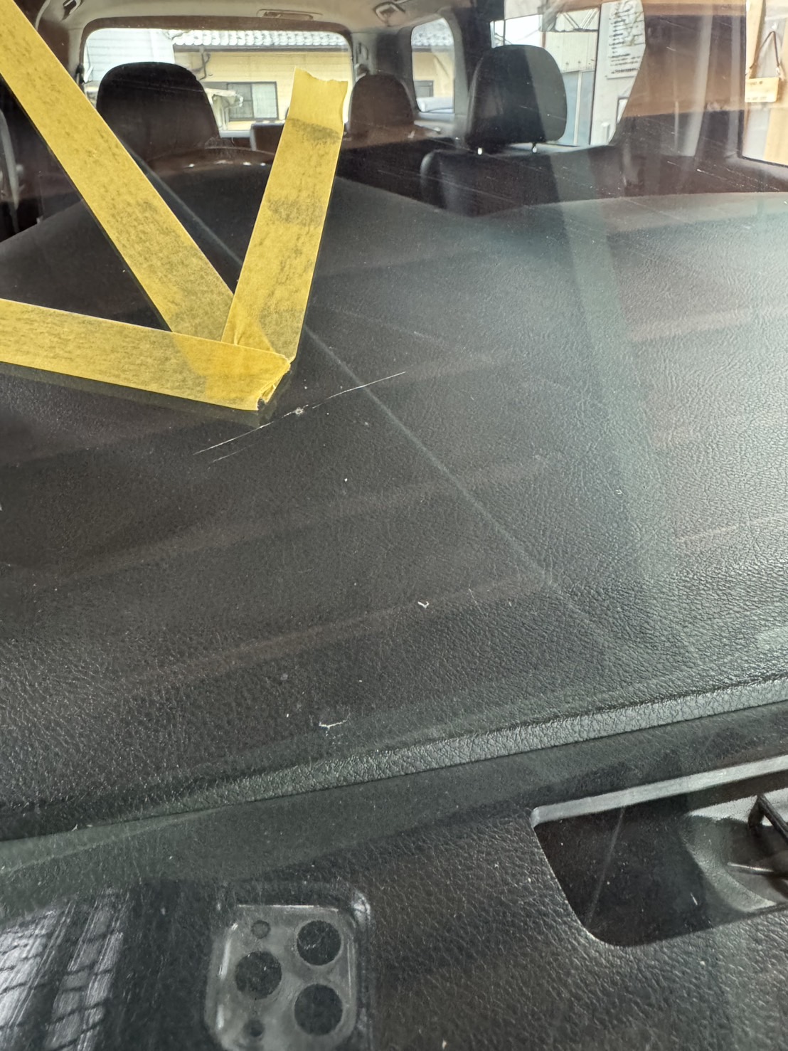 運転席側のフロントガラスに飛び石による大きなヒビが入り、視界の一部に影響が出ていました。