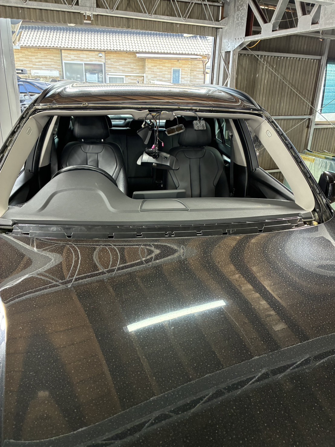 ワイパーやモール類を丁寧に取り外し、破損したガラスを慎重に車体から取り外しました。接着面に残った古い接着剤や汚れをしっかり除去し、新しいガラスが正確に取り付けられるよう下地を整えました。